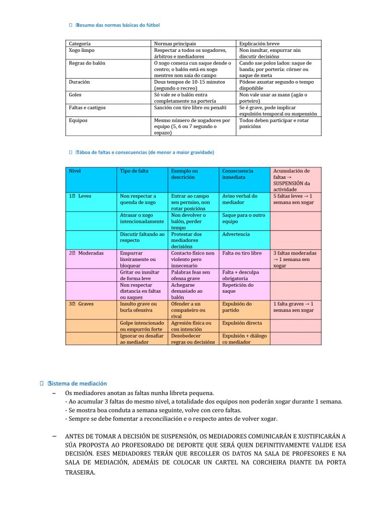 Ademais, os mediadores e mediadoras de fútbol levarán un rexistro das faltas e dos conflitos, co único fin de ir reducindo pouco a pouco o seu número. Este rexistro axudaranos a ver como imos mellorando, como cada vez hai menos problemas e máis respecto no xogo. Estes logros compartiranse con toda a comunidade educativa, para que todo o mundo vexa o bo traballo que se está a facer.
